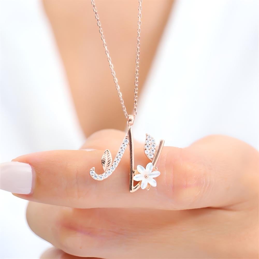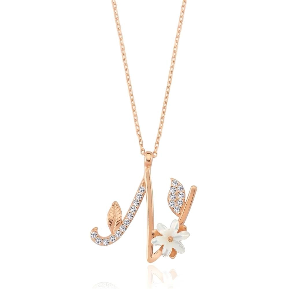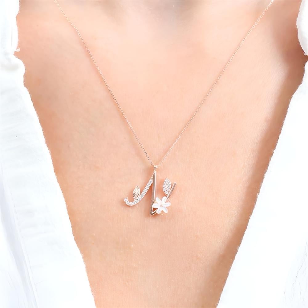 سلسال فضة راقي مطلي بالذهب، يحمل حرف (N) مرصّع بفصوص سواروفسكي أنيقة، تتوسطه زهرة راقية تزيده سحراً