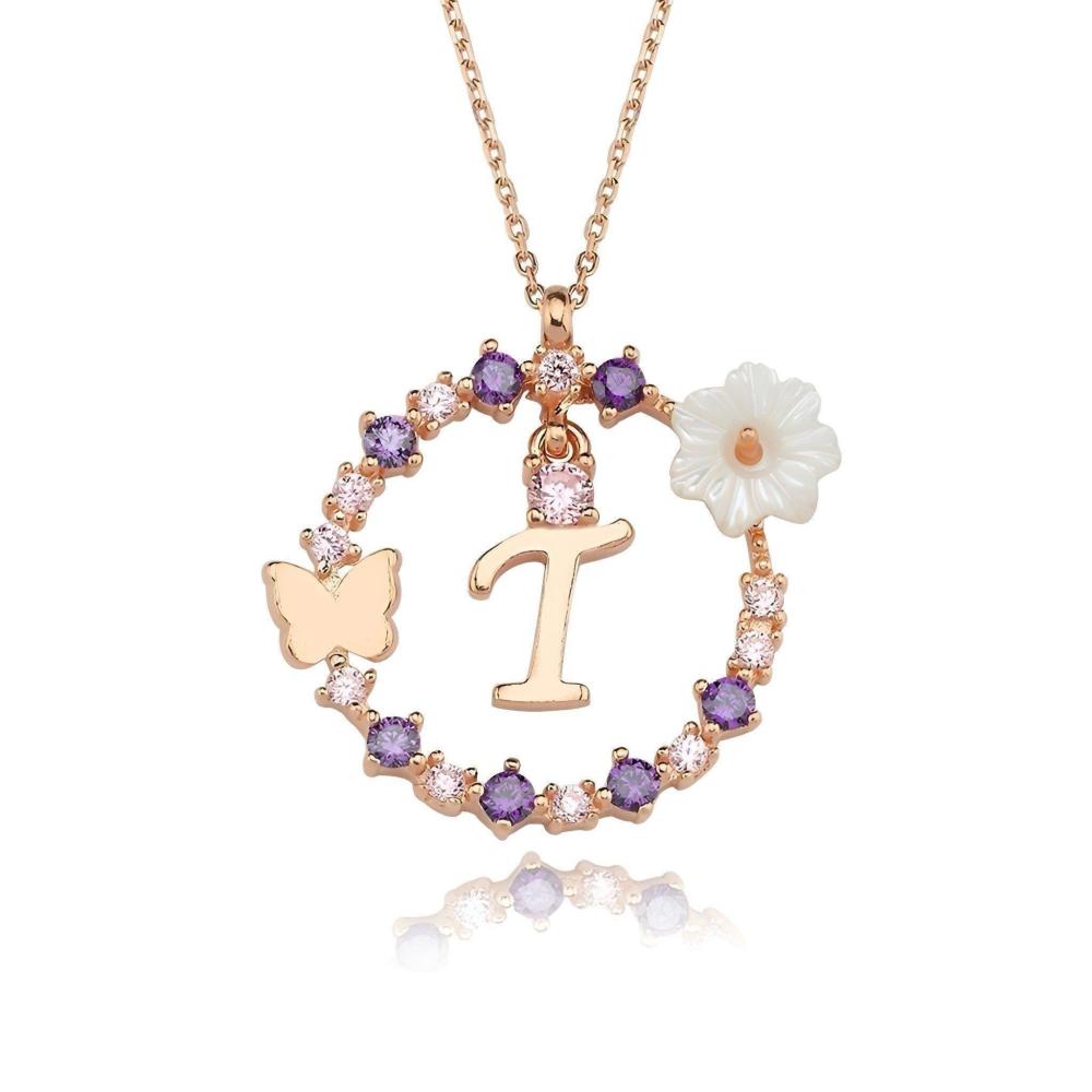 سلسال فضة فريد مطلي بالذهب بحرف (T)، يزدان بفراشة رقيقة وزهرة أنيقة، مرصّع بأحجار الزركون المتناغمة