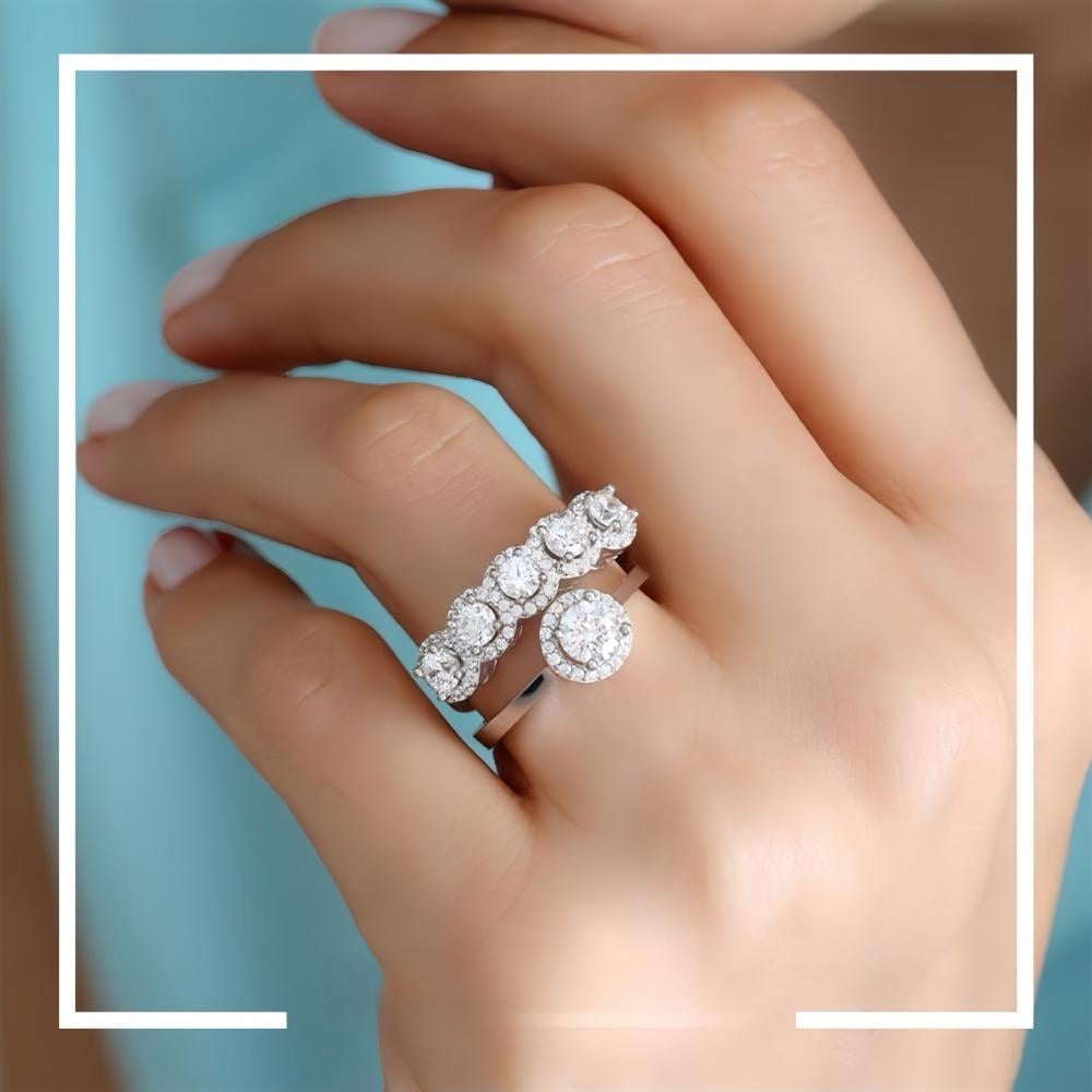 أضيفي لمسة من السحر إلى إطلالتك مع هذا الخاتم الرائع والمصنوع من الفضة الخالصة عيار 925, يتميز بتصميمه الفريد الذي يضم خمسة أحجار سوارفيسكي لامعة ما يضمن تألقاً استثنائياً في جميع المناسبات.