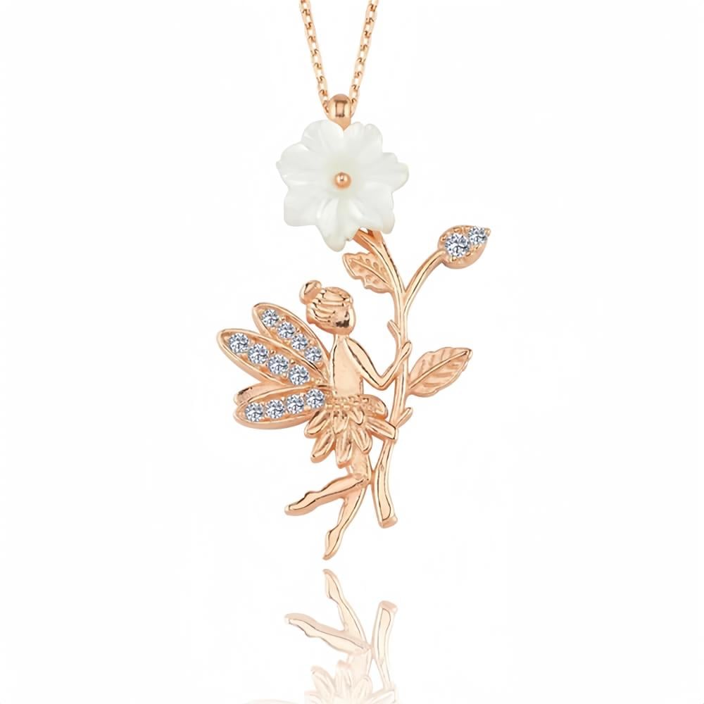 قلادة ملاك الحظ فضة بصياغة أنيقة مزينة بزهرة بيضاء مطلية ذهب