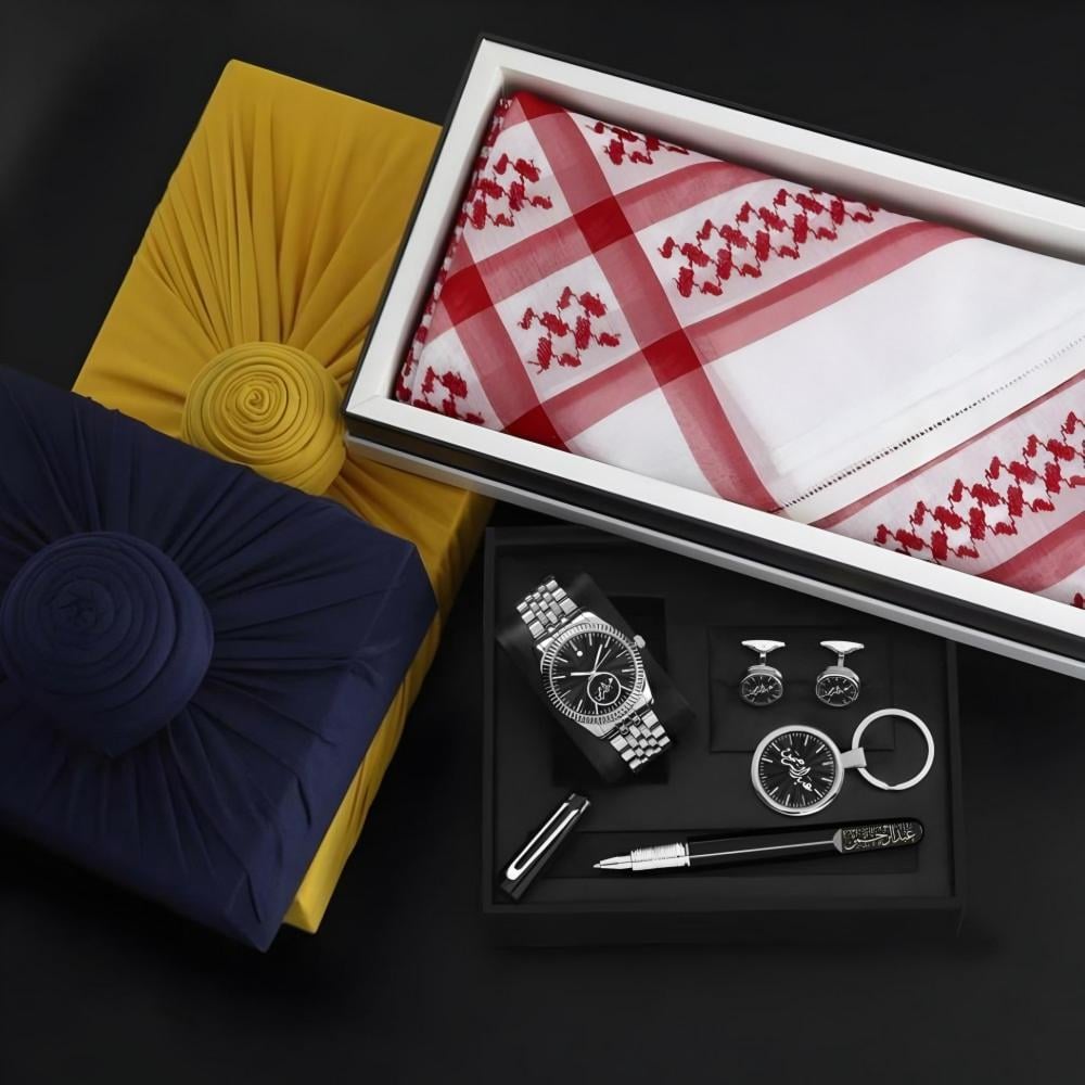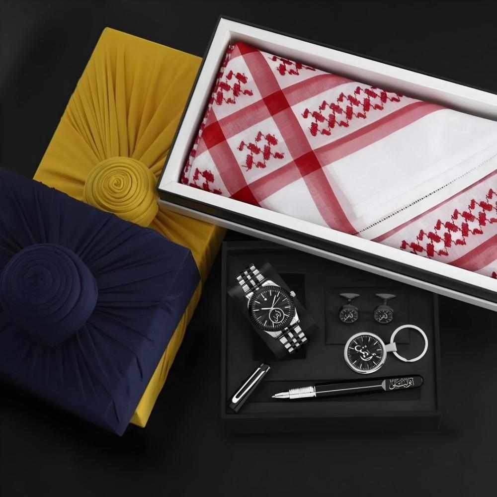 بوكسات هدايا رجالية راقية بساعة مميزة مع شماغ ومجموعة إكسسوارات أنيقة