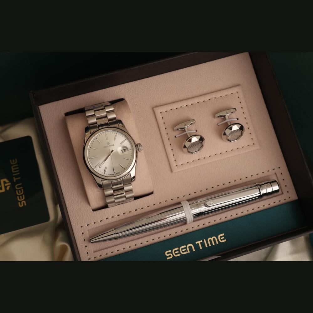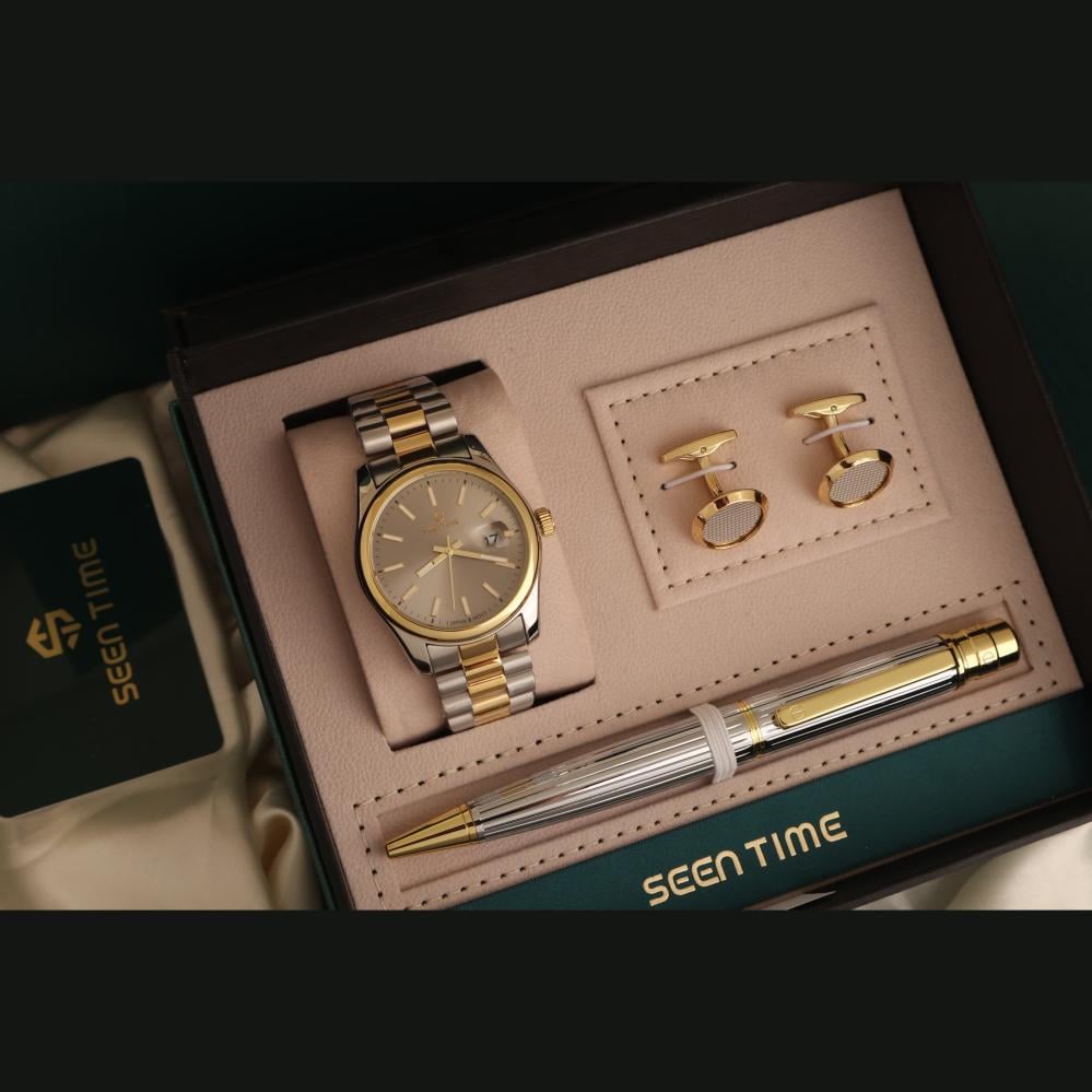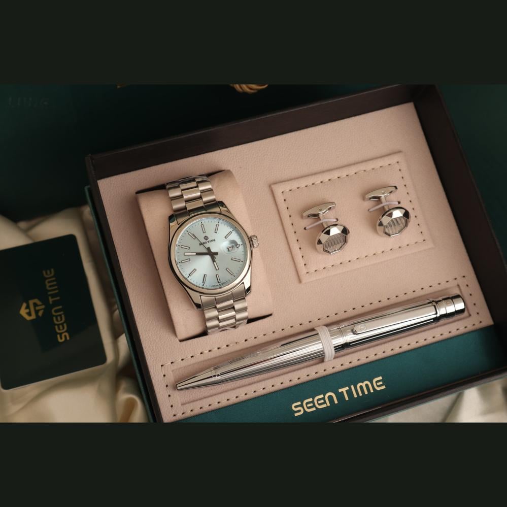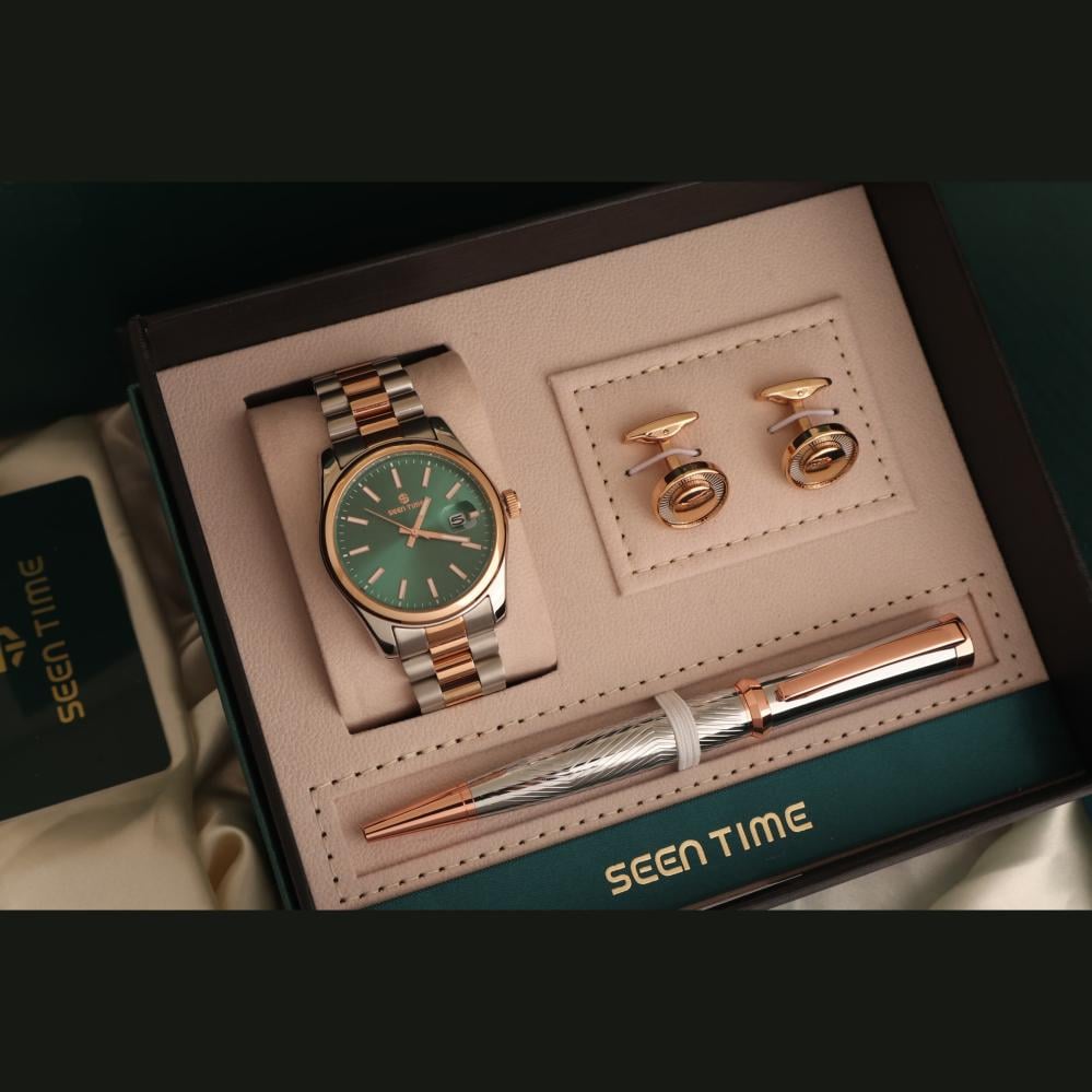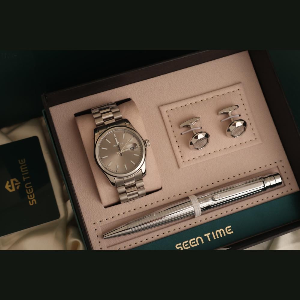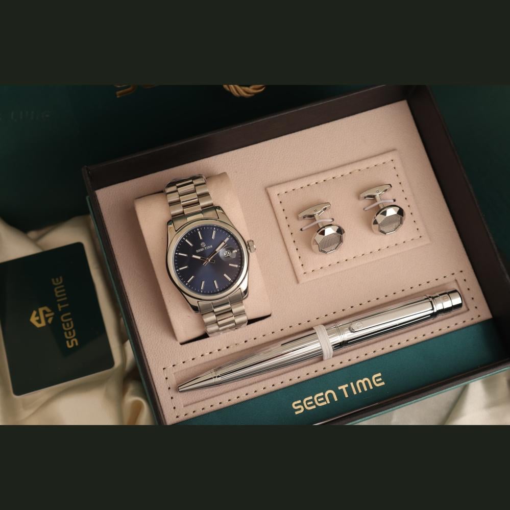 - يتكون الطقم من : (ساعة رجالية فخمة بعداد تاريخ - قلم أنيق - كبك مميز - علبة طقم فخمة - كيس كرتوني أنيق).