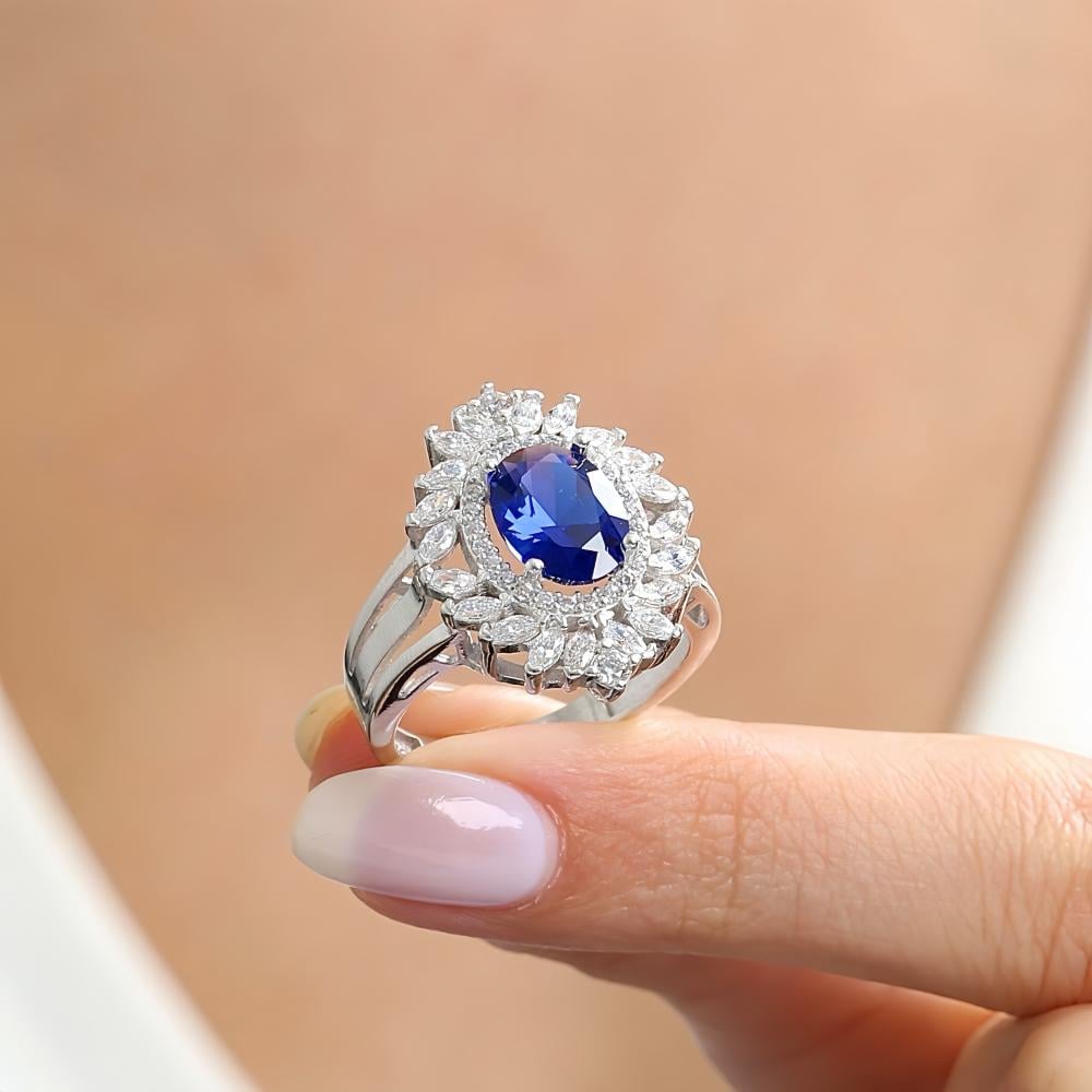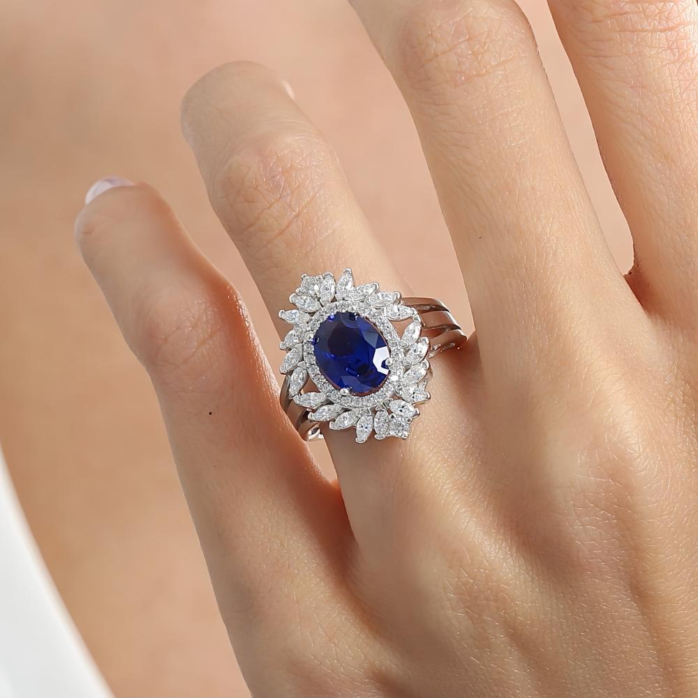 خاتم نسائي راقي فضة خالصة بحجر ياقوت أزرق محاط بفصوص مميزة