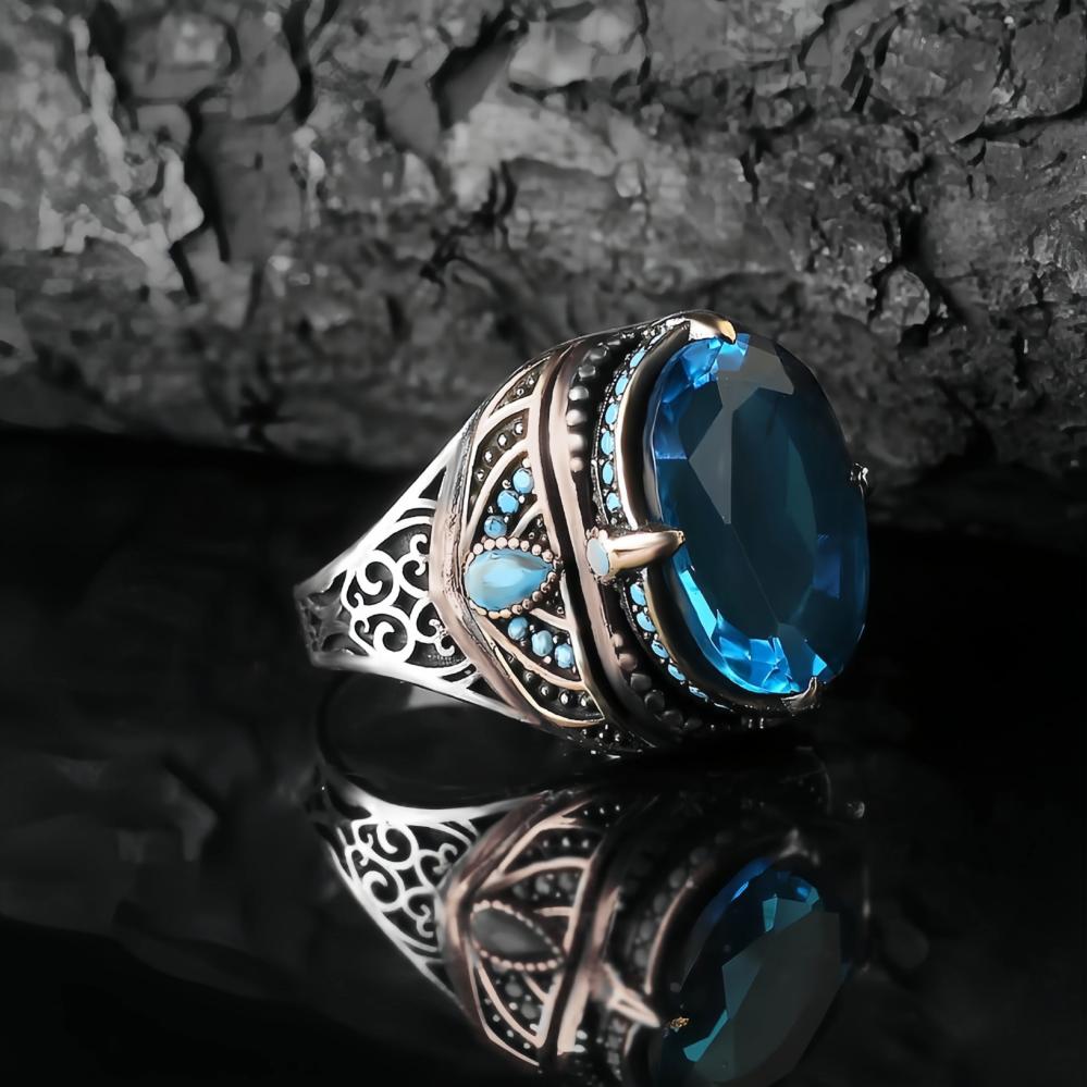 خاتم مرصع بحجر زركون أزرق بصياغة مميزة من الفضة الخالصة عيار 925