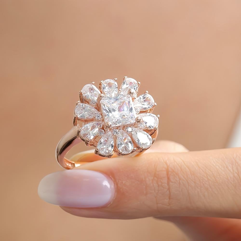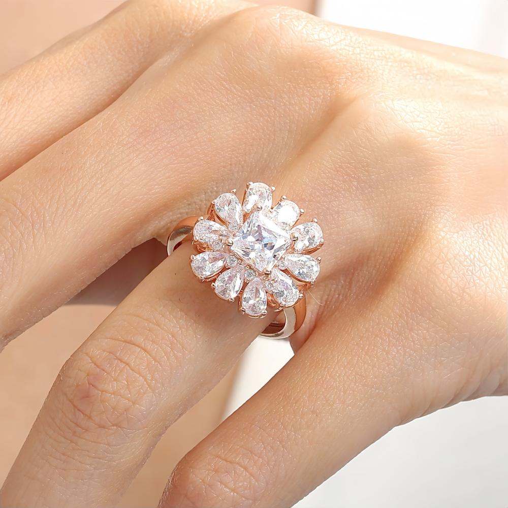 تصميمه الرائع يتميز بحجر مركزي مربّع محاط بفصوص موزعة بعناية من حوله، مما يمنحه شكل زهرة متفتحة بتألق لا مثيل له.