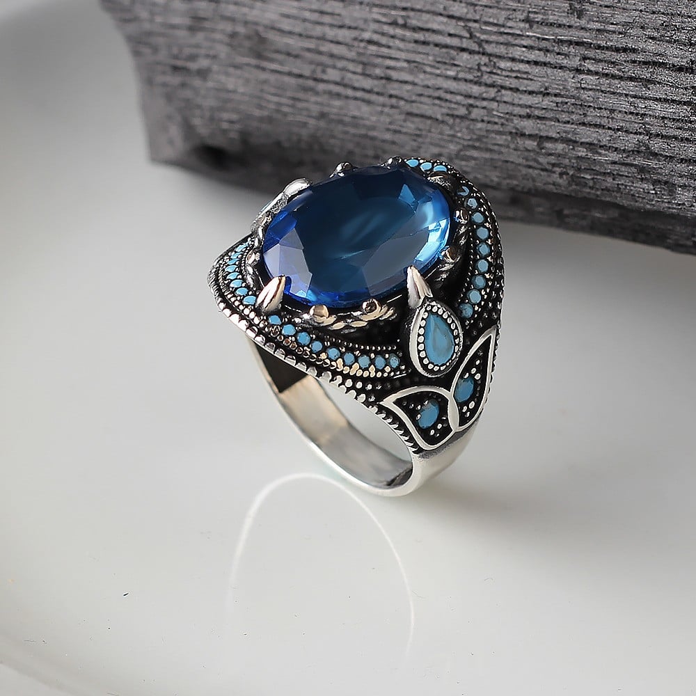 خاتم راقي بحجر زركون أزرق وبصياغة مميزة من الفضة الخالصة