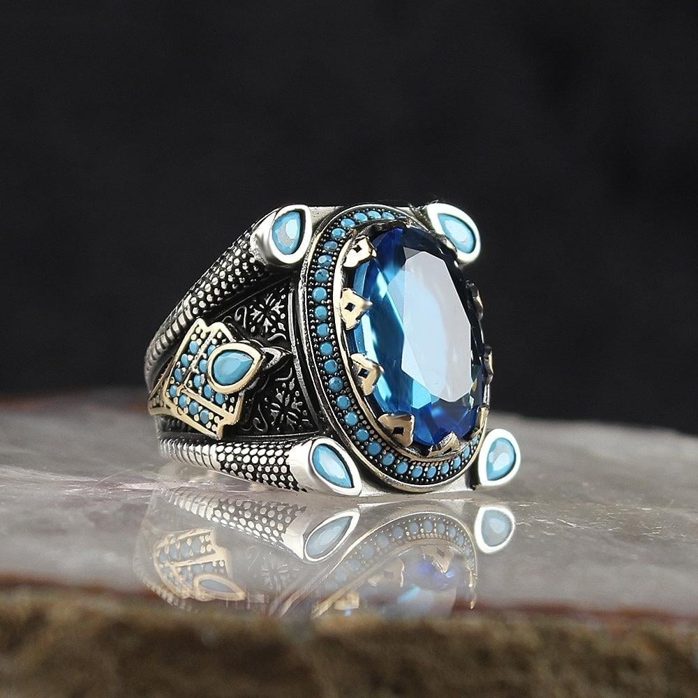 خاتم فاخر فضة إسترلينية خالصة - مرصع بحجر زركون أزرق ساحر
