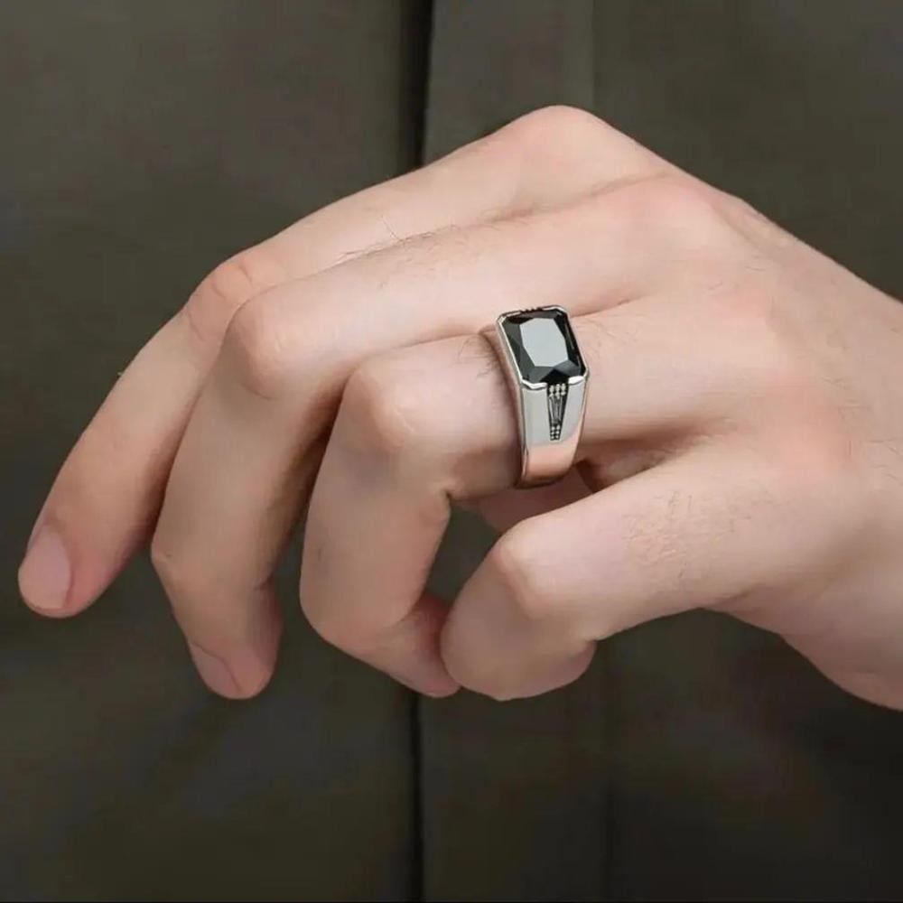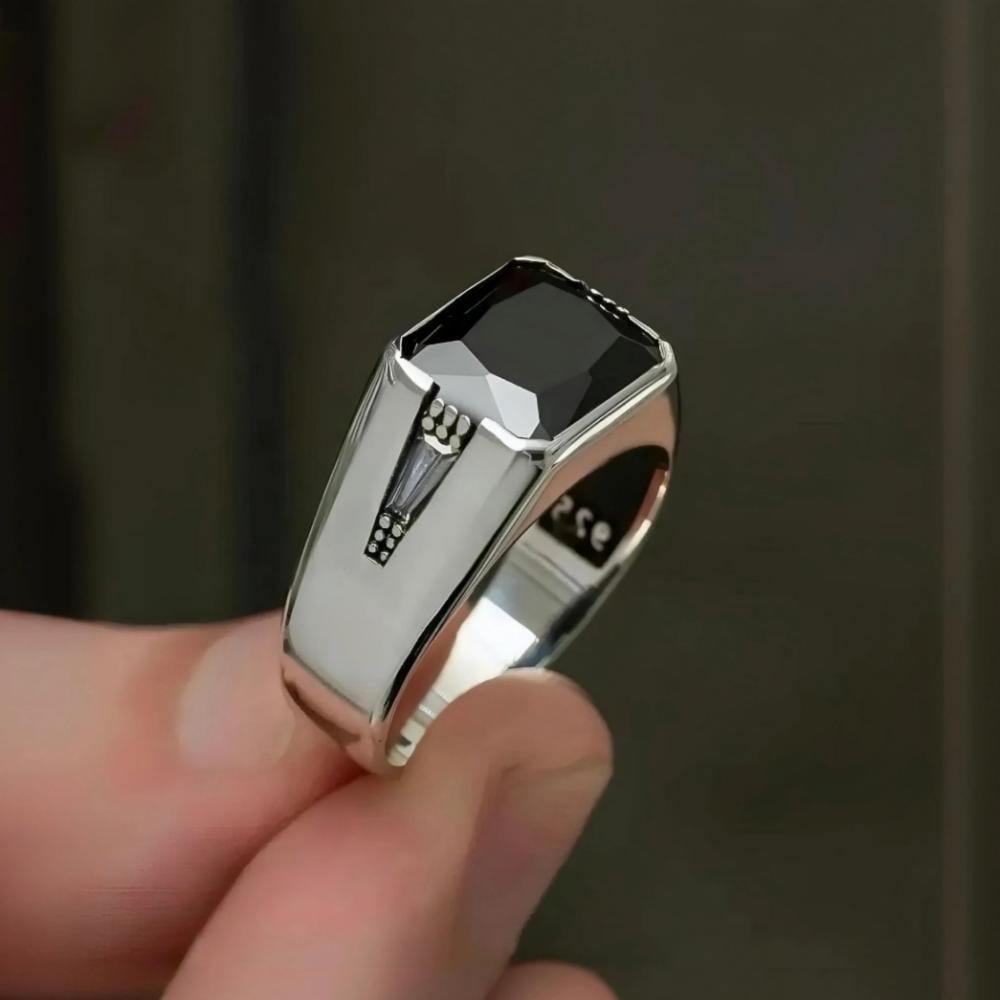 خاتم فضة أنيق بصياغة ناعمة و مرصع بحجر زركون أسود مميز