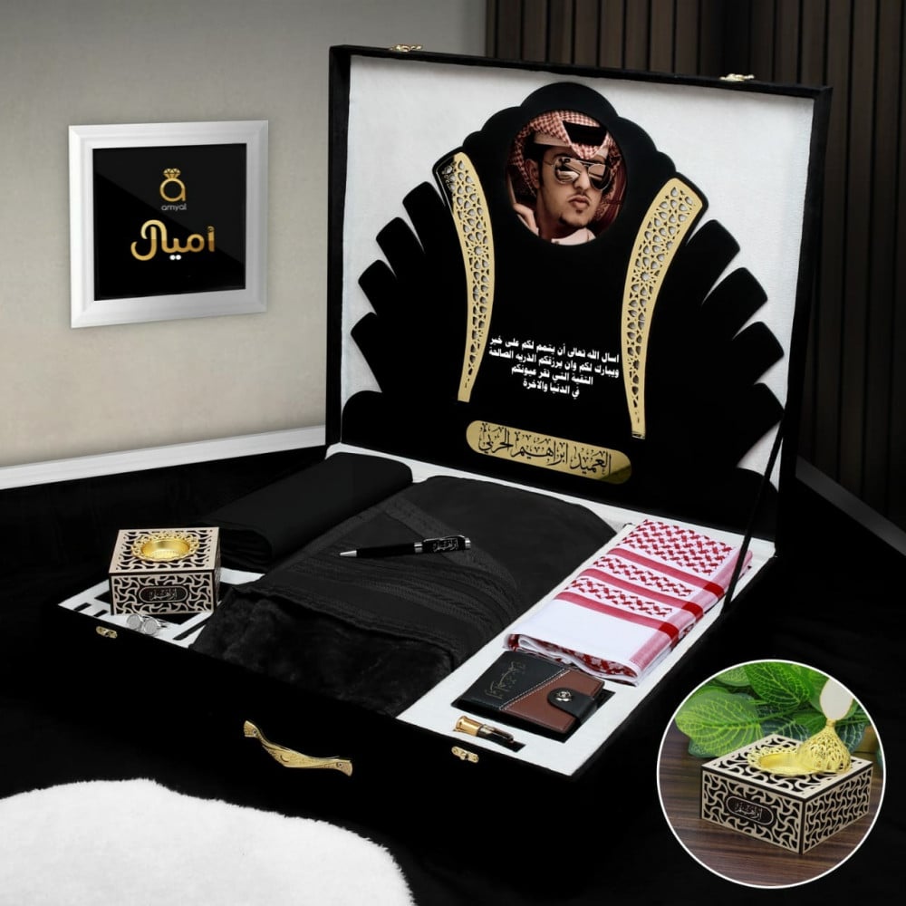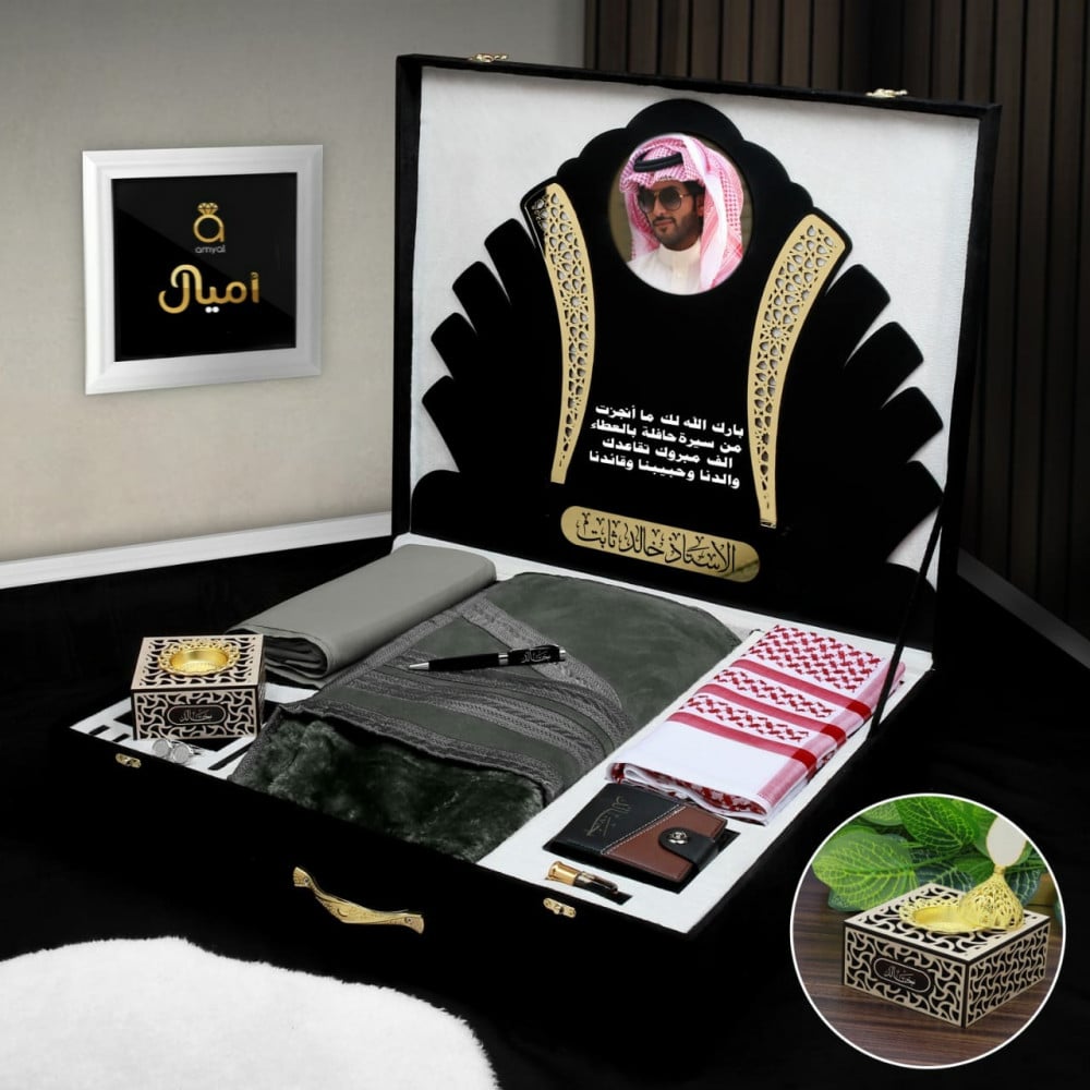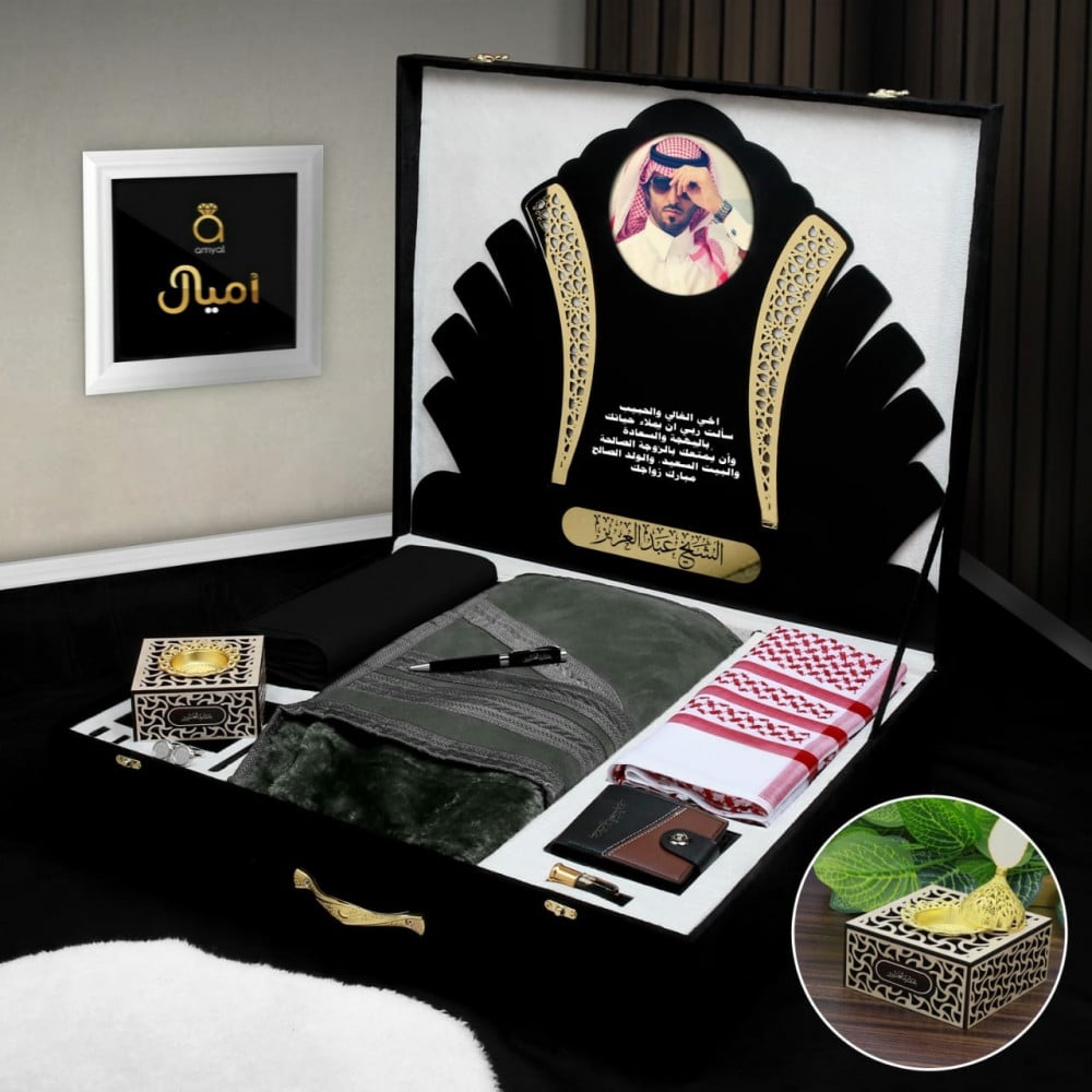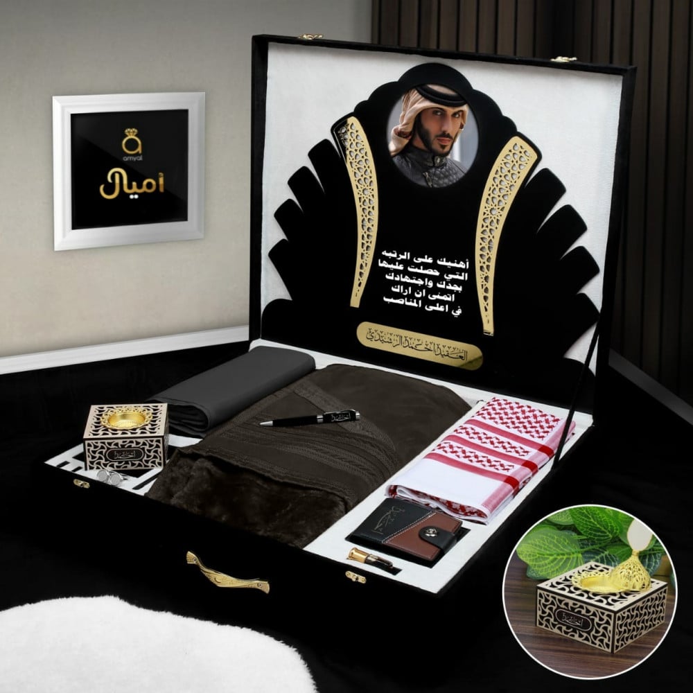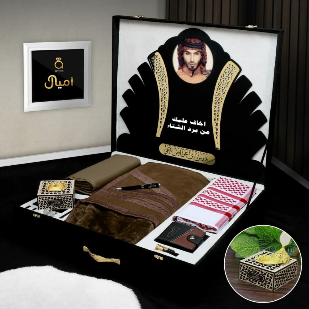 - يتكون البوكس من : (قماش شتوي عالي الجودة مع الملحقات 8 زراير مع علامتين الجيب والرقبة - شماغ خامة سوبر ديلوكس - فروة شامواه صناعة سورية - كبك أنيق - قلم بالإسم نحت ليزر - مبخرة خشبية - محفظة جلد - ربع تولة عودة - بوكس إهداء فخم مع براوز خشبي داخلي بإضافة اكريليك ذهبي نفس الصورة).
