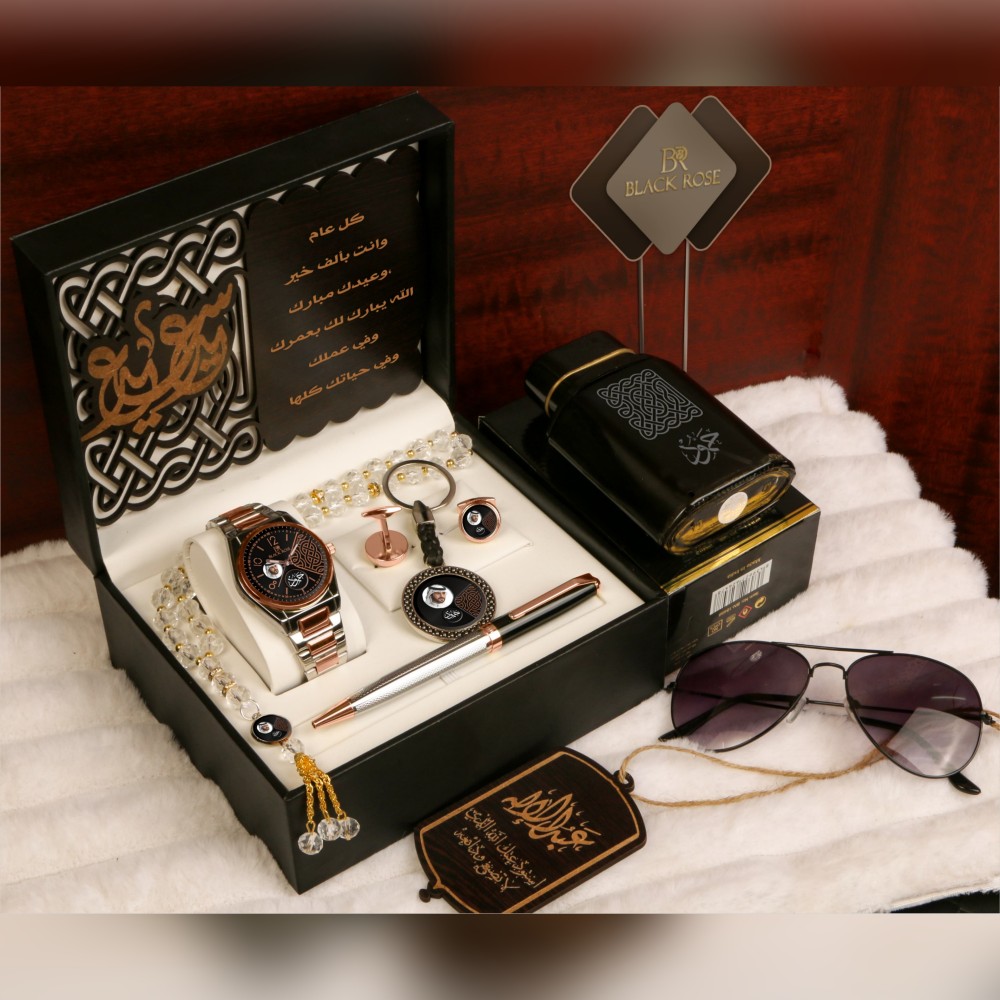 - يتكون الطقم من : (ساعة رجالية فخمة - قلم كلاسيك - كبك - تعليقة سيارة - عطر رجالي برائحة مميزة - ميدالية مفاتيح - نظارة - سبحة - علبة طقم فخمة مع برواز خشبي داخلي للصورة والعبارة - كيس هدايا كرتوني أنيق).