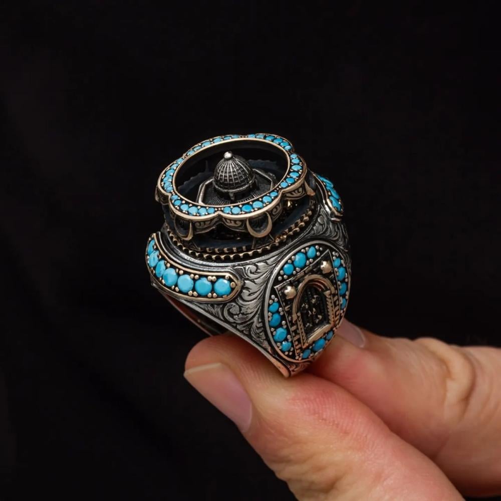 Crafted from pure silver and embellished with turquoise stones, this ring exudes a sense of luxury and historical beauty. Its design, inspired by the Dome of the Rock and Al-Aqsa Mosque, reflects skill and precision in craftsmanship, adding a touch of elegance to your look.