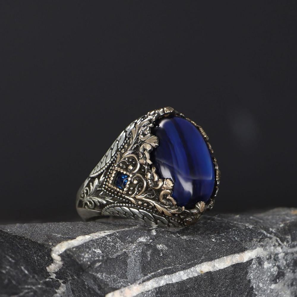 This ring features delicate engravings and decorations surrounding its sides, giving it an artistic touch that reflects skill and craftsmanship in design, in addition to the installation of a natural blue tiger's eye agate stone, which enhances the ring's elegance and brilliance on the finger of the wearer.