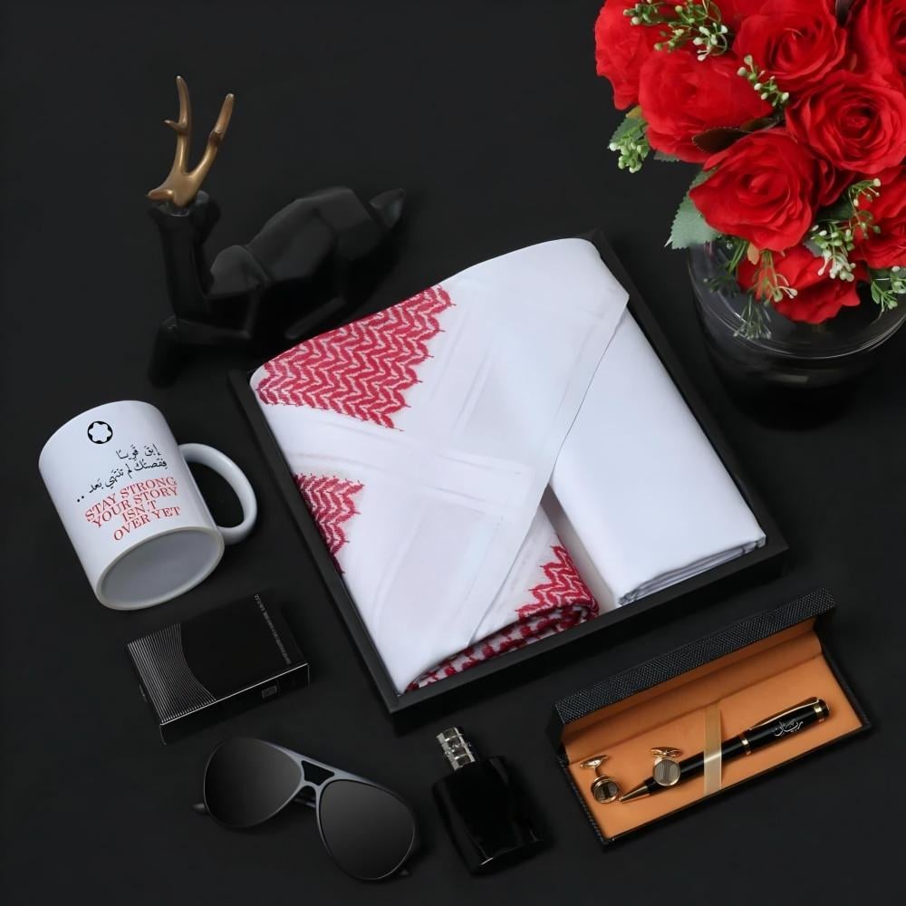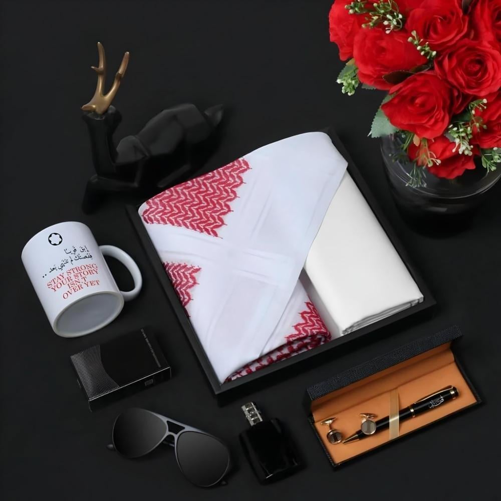 A luxurious gift box containing a high-end shemagh, fabric, and a set of elegant men's accessories.