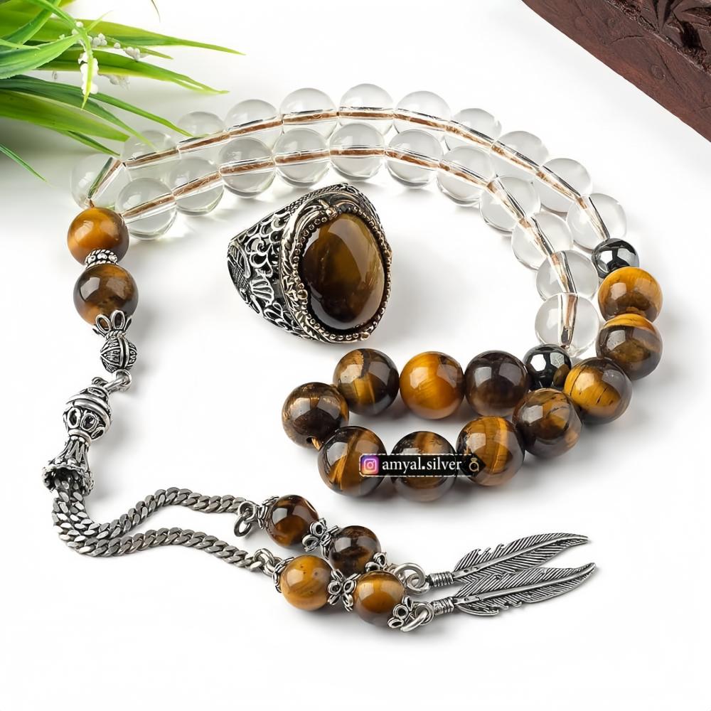 649- The set consists of a luxurious ring crafted in fine 925 sterling silver, studded with a natural tiger's eye agate stone, along with a unique rosary made of tiger's eye agate and Najaf stones, and a tassel made of pure silver.